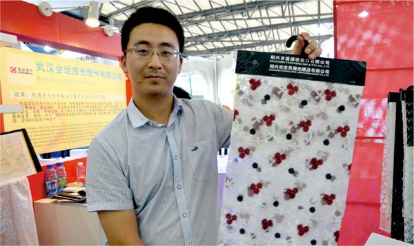 金運激光的負責人展示用激光技術加工的花紋麵料