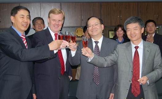 圖為中歐紡機展會巨頭在京簽署長期合作協議後舉杯慶賀