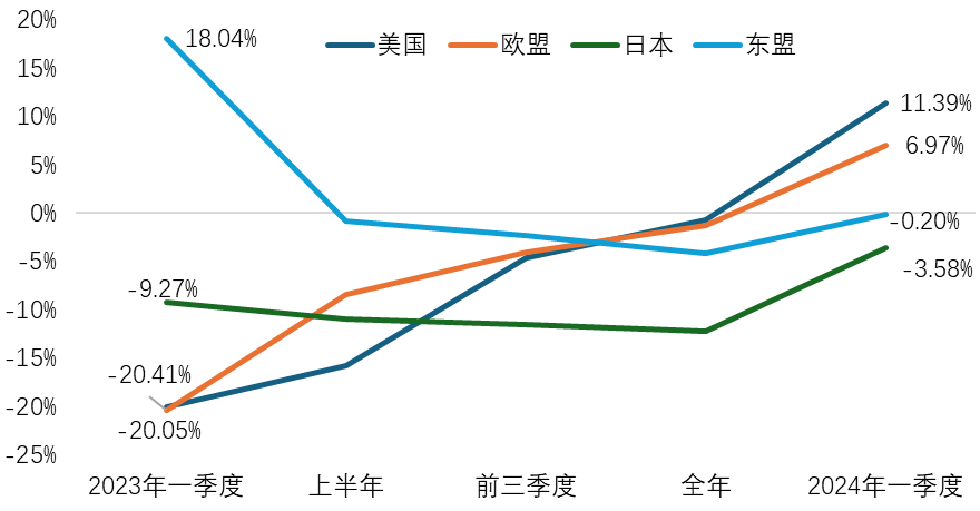 圖4. 2023年-2024年一季度我國家紡主要市場出口額增長走勢