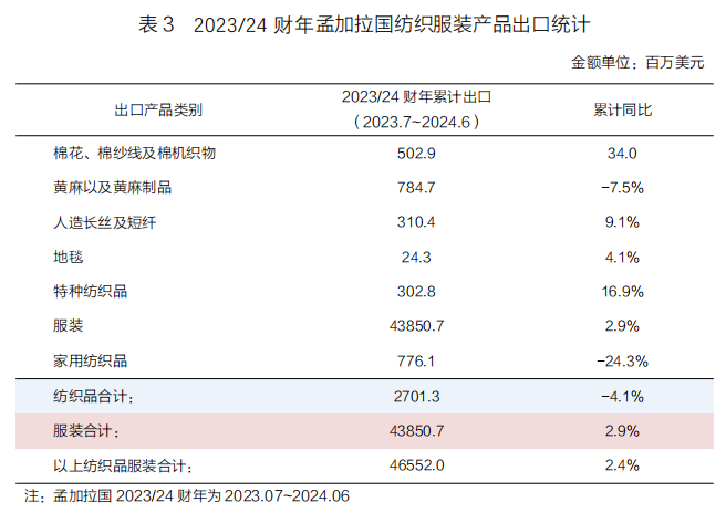 根據孟加拉國服裝製造及出口商協會(BGMEA)數據,2023/24財年前11個月(2023.7~2024.5),孟加拉國對全球出口服裝438.5億美元,同比增加2.9%。其中,針織服裝出口247.1億美元,同比增長6.2%;機織服裝出口191.4億美元,同比減少1.1%。同期,孟加拉國對全球出口乐动买球平台 27億美元,同比下降4.1%。